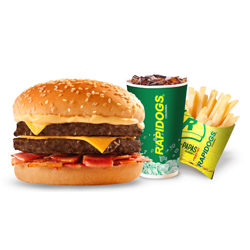 Hamburguesa doble carne, tocineta, doble queso americano, salsa cheddar y BBQ, gaseosa y acompañamiento a elección.