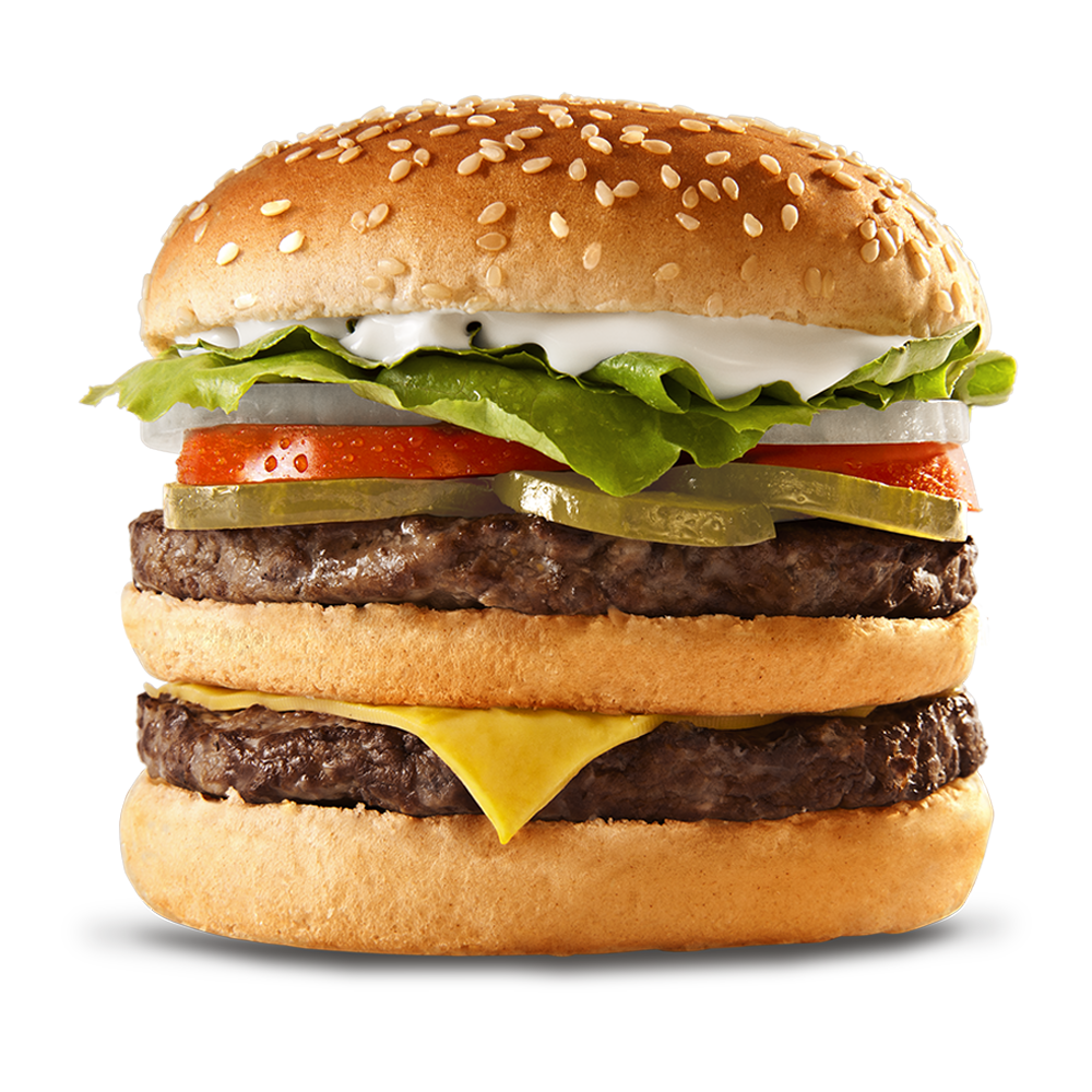 Hamburguesa doble, tres panes, queso americano, verduras, salsas.