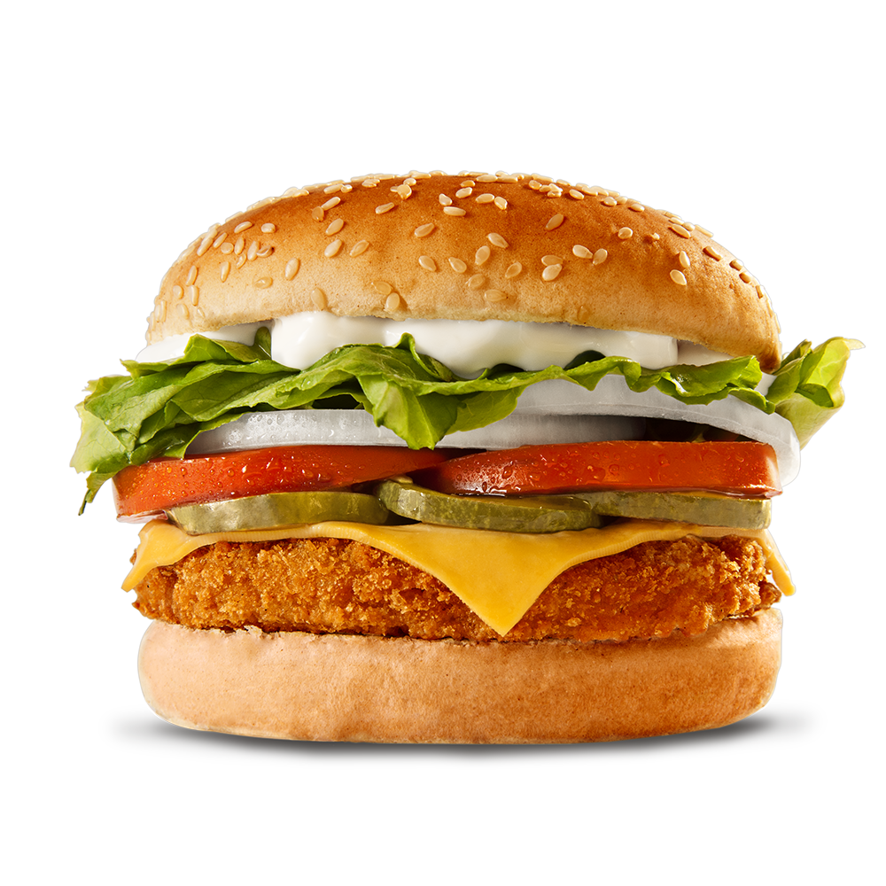 Hamburguesa de pollo, queso americano, verduras, salsas.