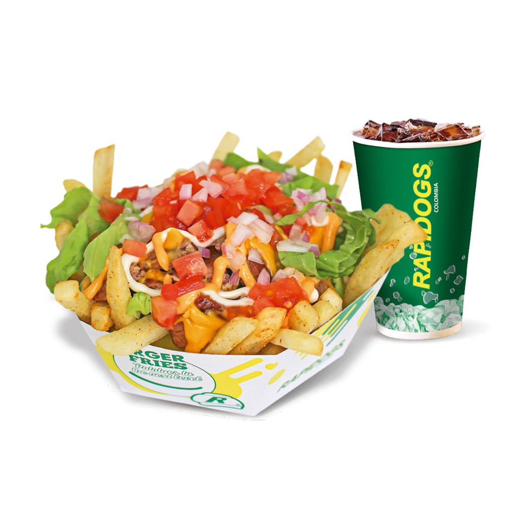 Papas francesas con salsas de queso cheddar, mayonesa, trozos de carne de res, queso americano fundido, julianas de lechuga, cebollín, trozos de tomate maduro, trozos de cebollas de piel roja y gaseosa a elección.
