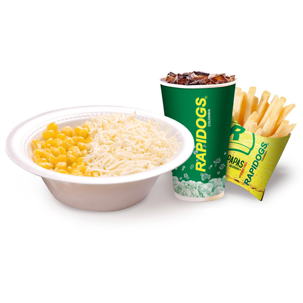 Maicitos con maíz tierno, mantequilla, salsa rapidogs, queso blanco, acompañado con papas francesas y gaseosa a elección.