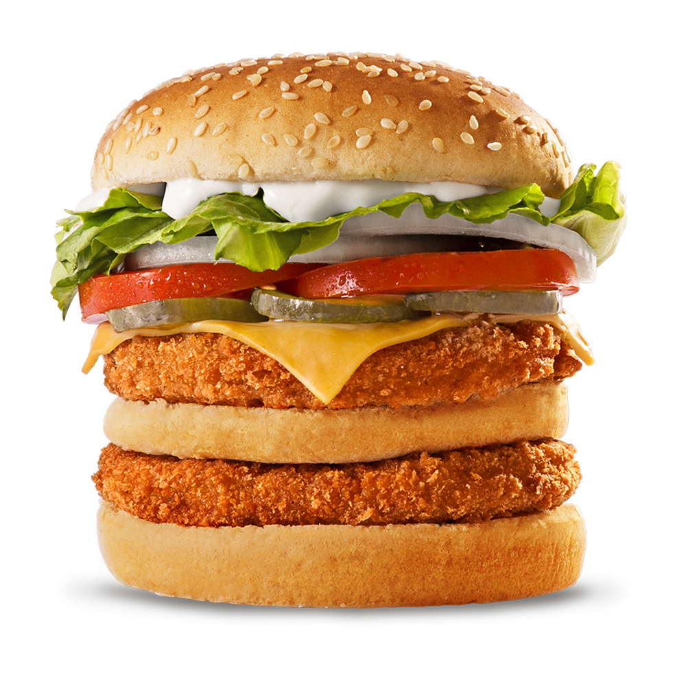 Hamburguesa doble de pollo, tres panes, queso americano, verduras, salsas.