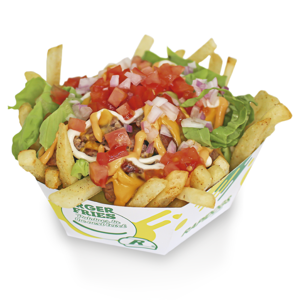 Papas francesas con salsas de queso cheddar, mayonesa, trozos de carne de res, queso americano fundido, julianas de lechuga, cebollín, trozos de tomate maduro, trozos de cebollas de piel roja.