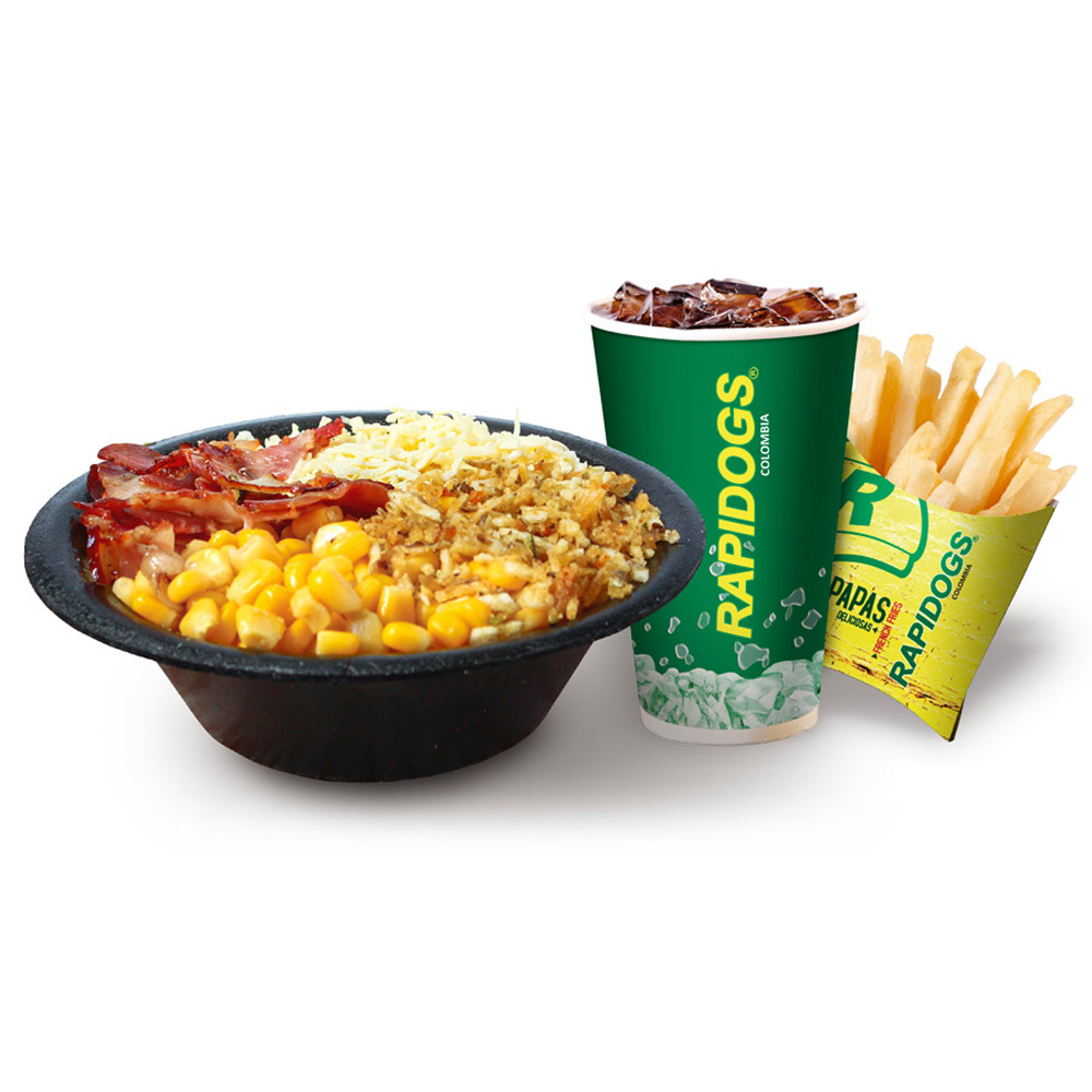 Maicitos con maíz tierno desgranado, mantequilla, queso blanco, tocineta, papa ripio, salsa rapidogs. acompañado con papas y gaseosa a elección.