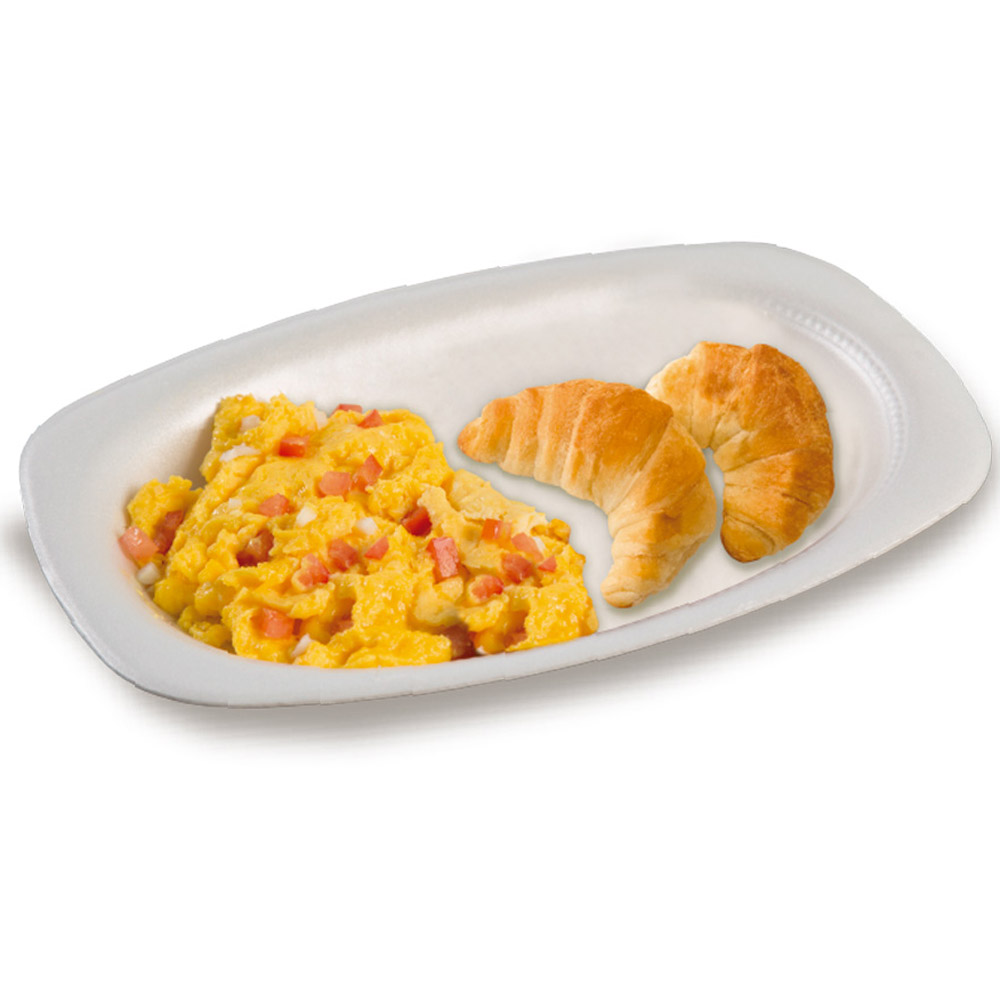 Desayuno, huevos revueltos con tomate y cebolla, acompañado de 2 mini croissant con queso.