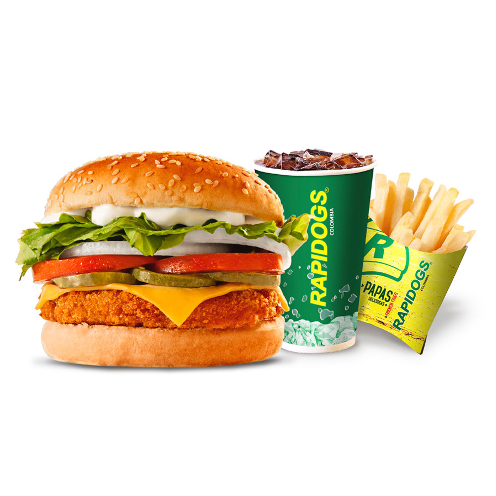 Hamburguesa de pollo, queso americano, verduras, salsas, gaseosa y acompañamiento a elección.