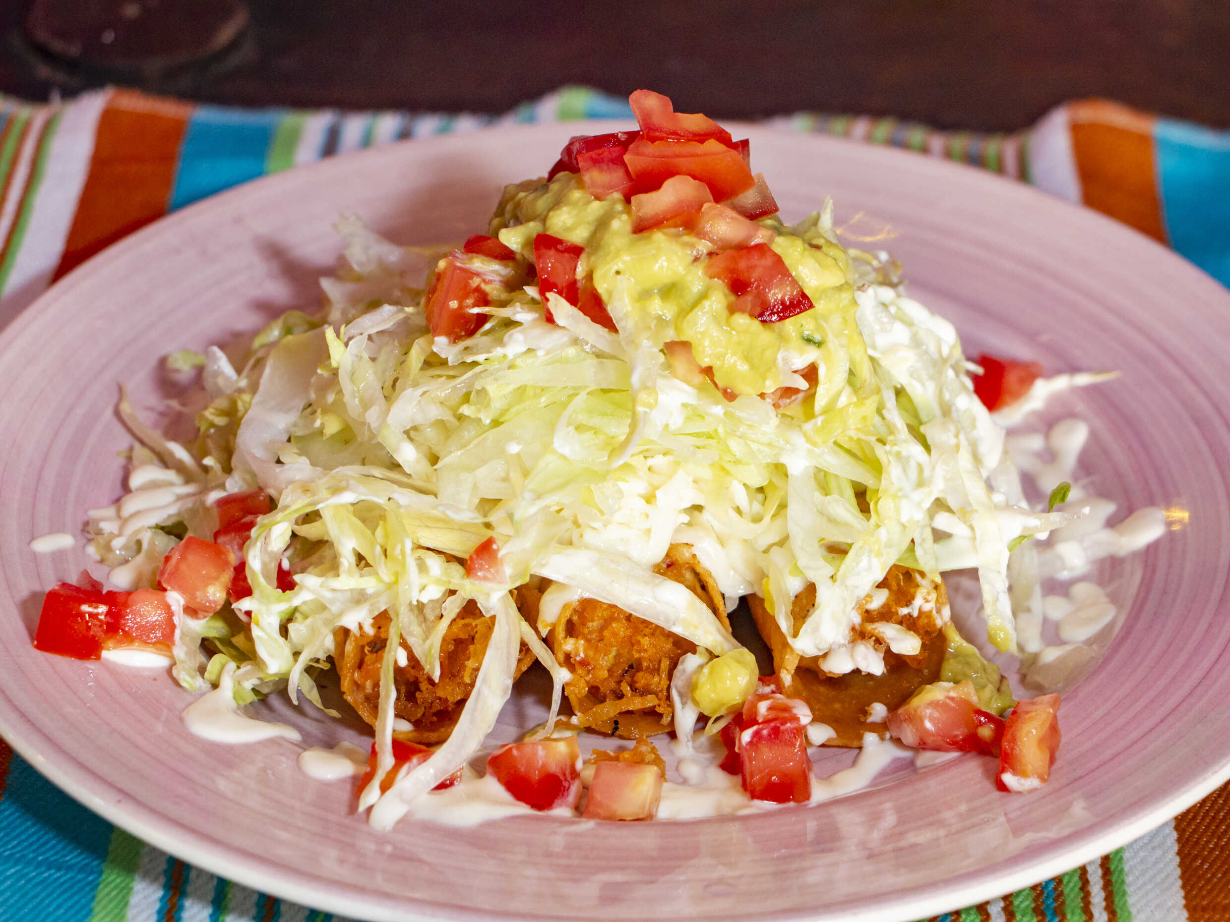 Tostada de maíz frita rellena de pollo, crema, queso, lechuga y guacamole (3 flautas).