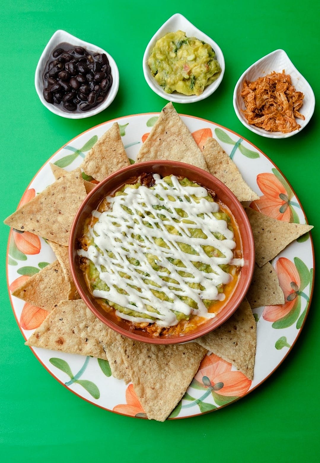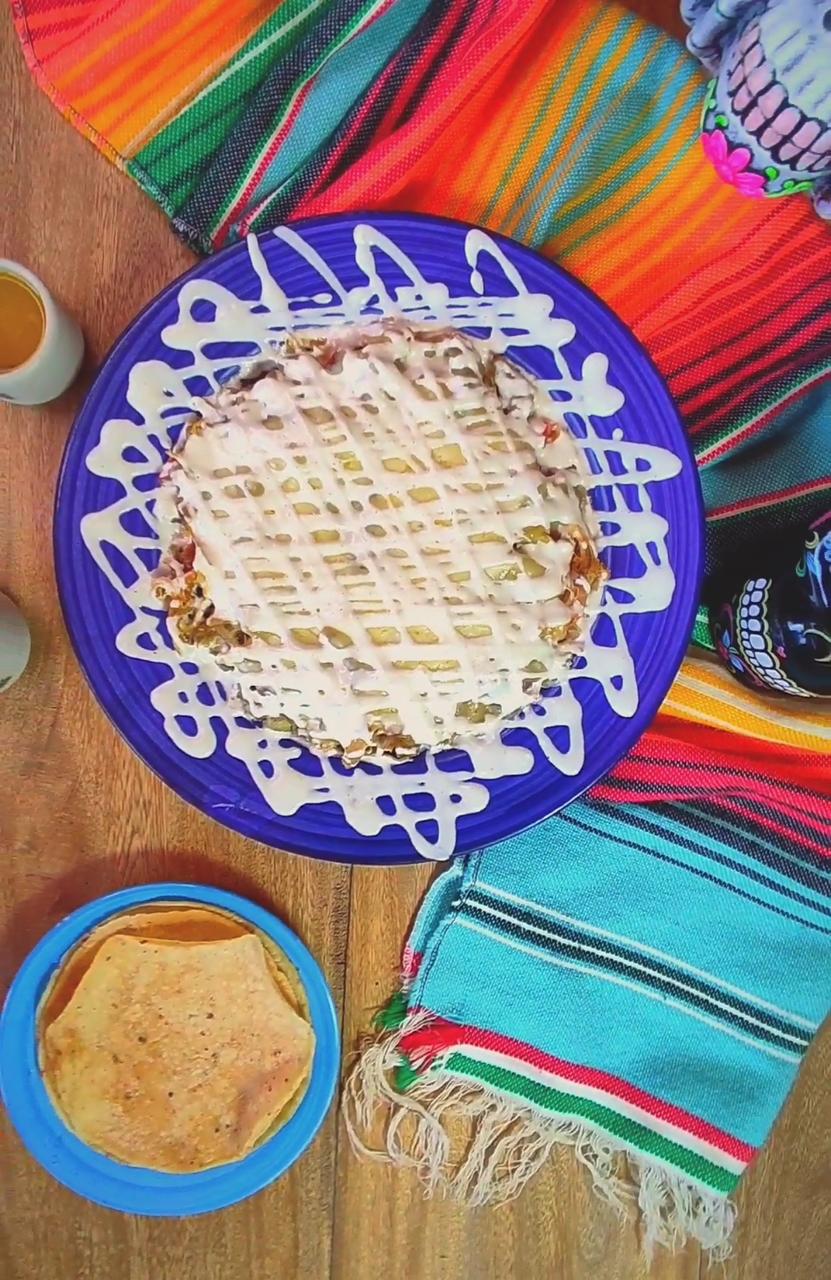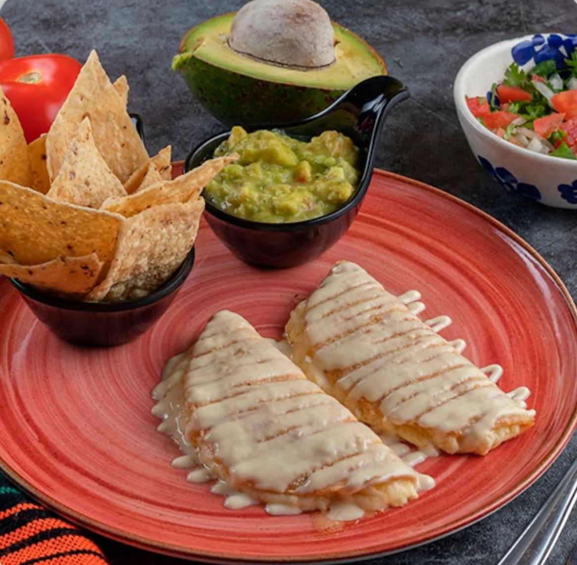 Tortilla de harina, queso, pollo, crema, guacamole y nachos.