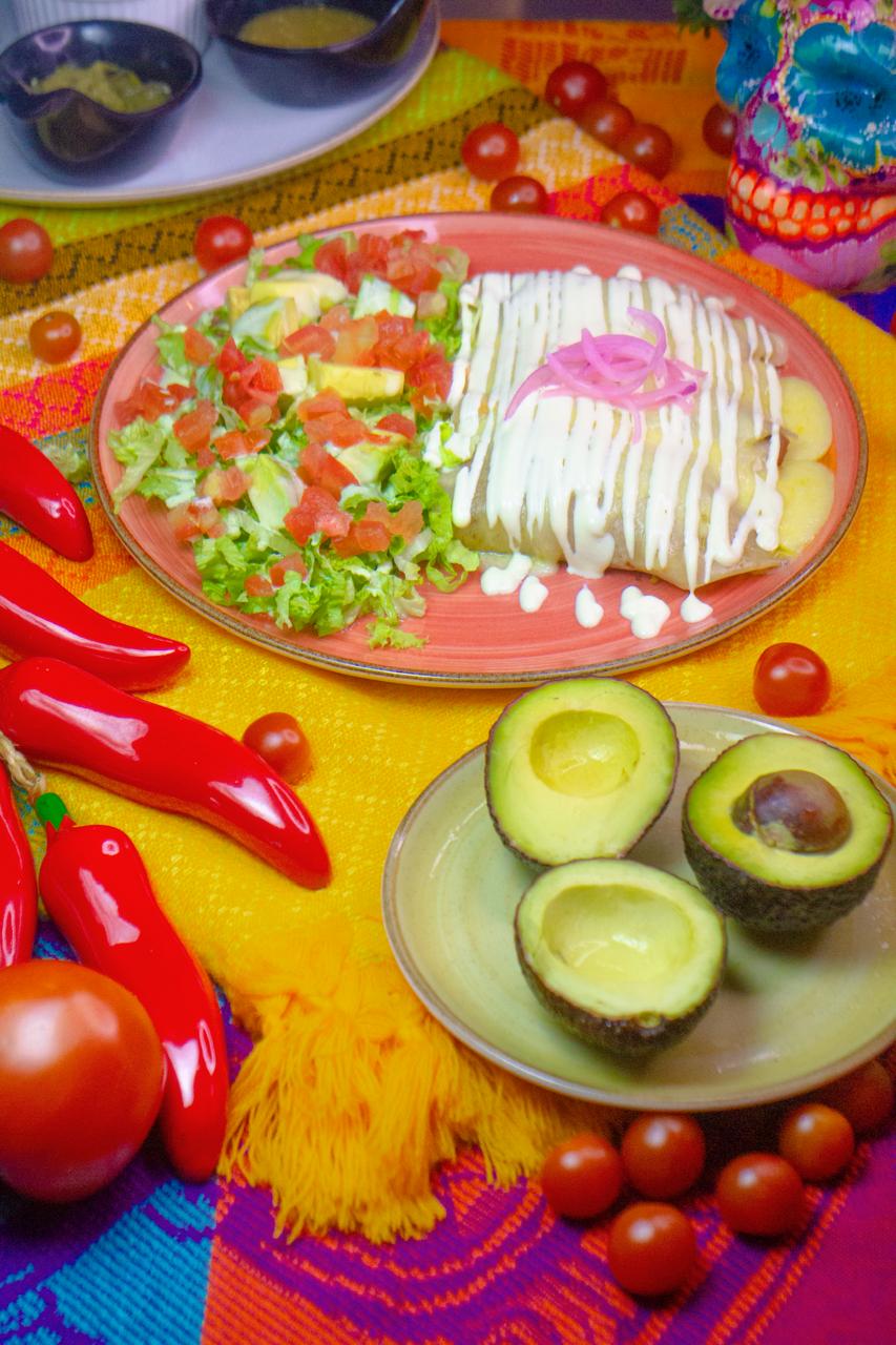 Tortilla de harina rellena de carne, pollo, pimentón, cebolla, tocineta, crema, queso, aguacate, acompañada de ensalada de lechuga y tomate.