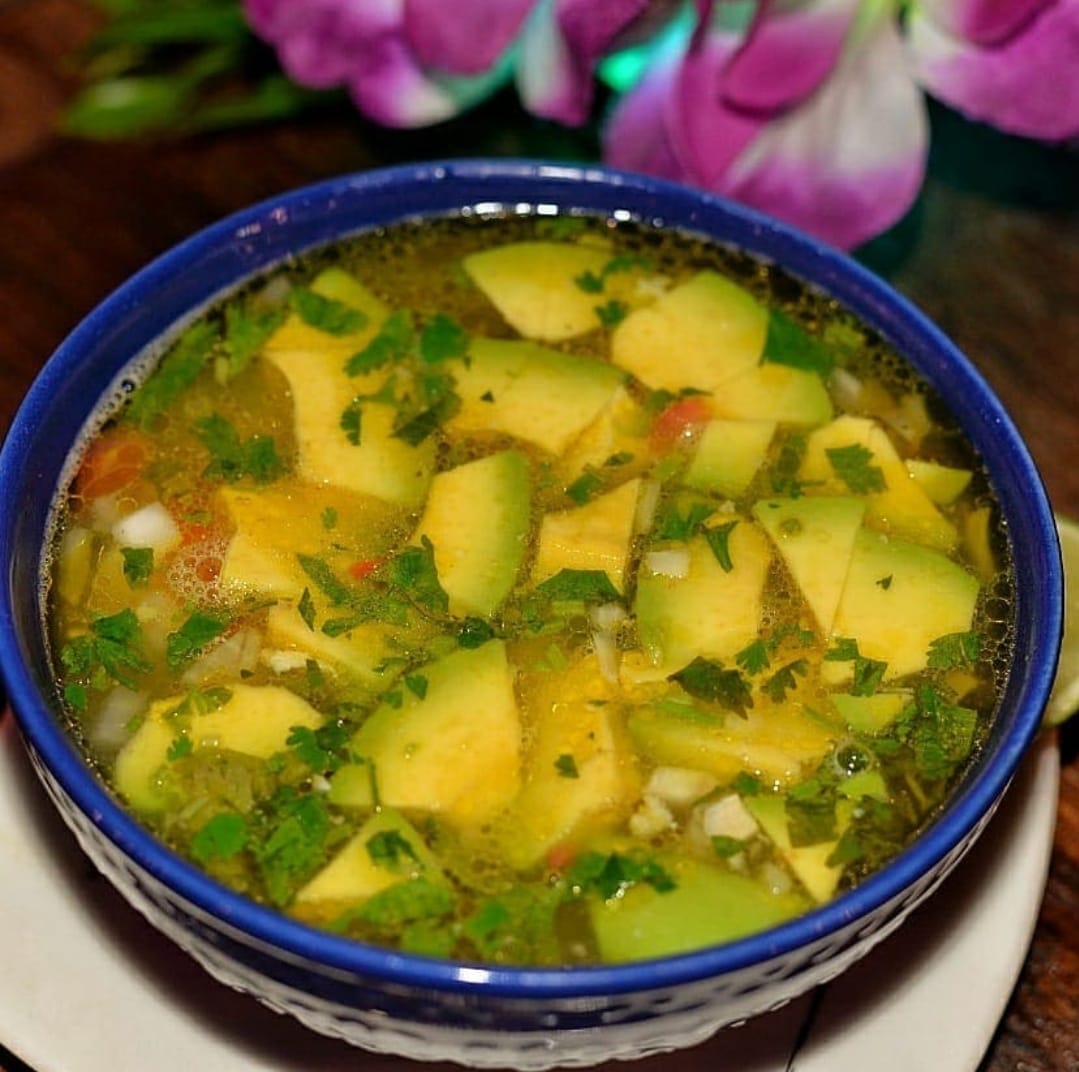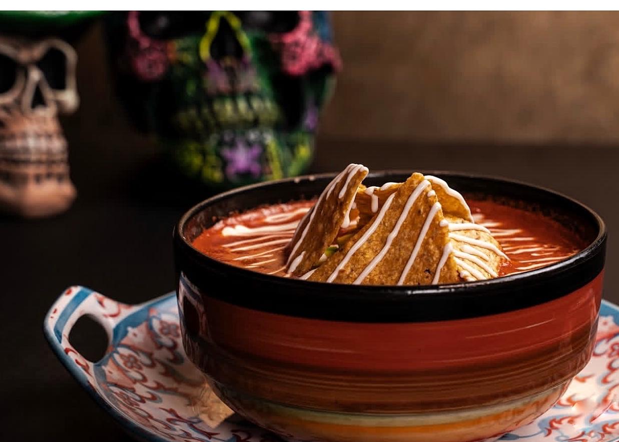 Delicioso caldo de tomate, acompañado de tortilla de maíz frita, sour cream, queso, chicharrón y aguacate.