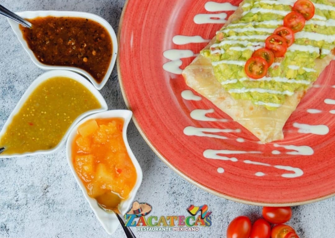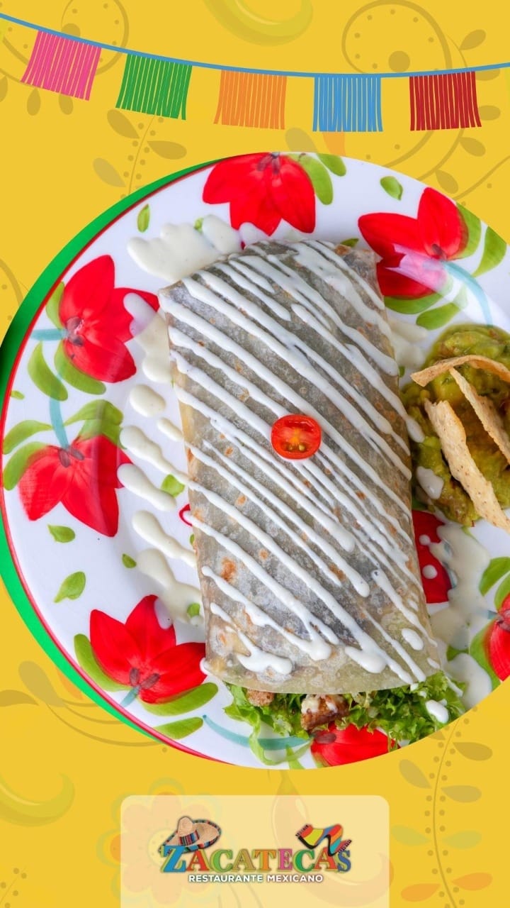 Tortilla de harina rellena de carne, cochinita, tocineta, crema, queso, guacamole y pico de gallo.