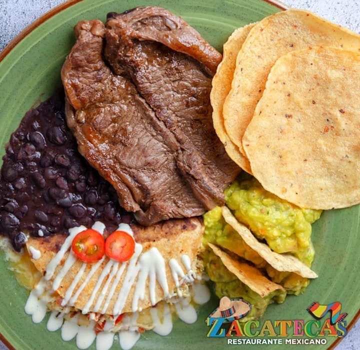 Carne de res, acompañada de frijol, guacamole, 1 tortilla rellena de pollo y 3 tortillas de maíz.