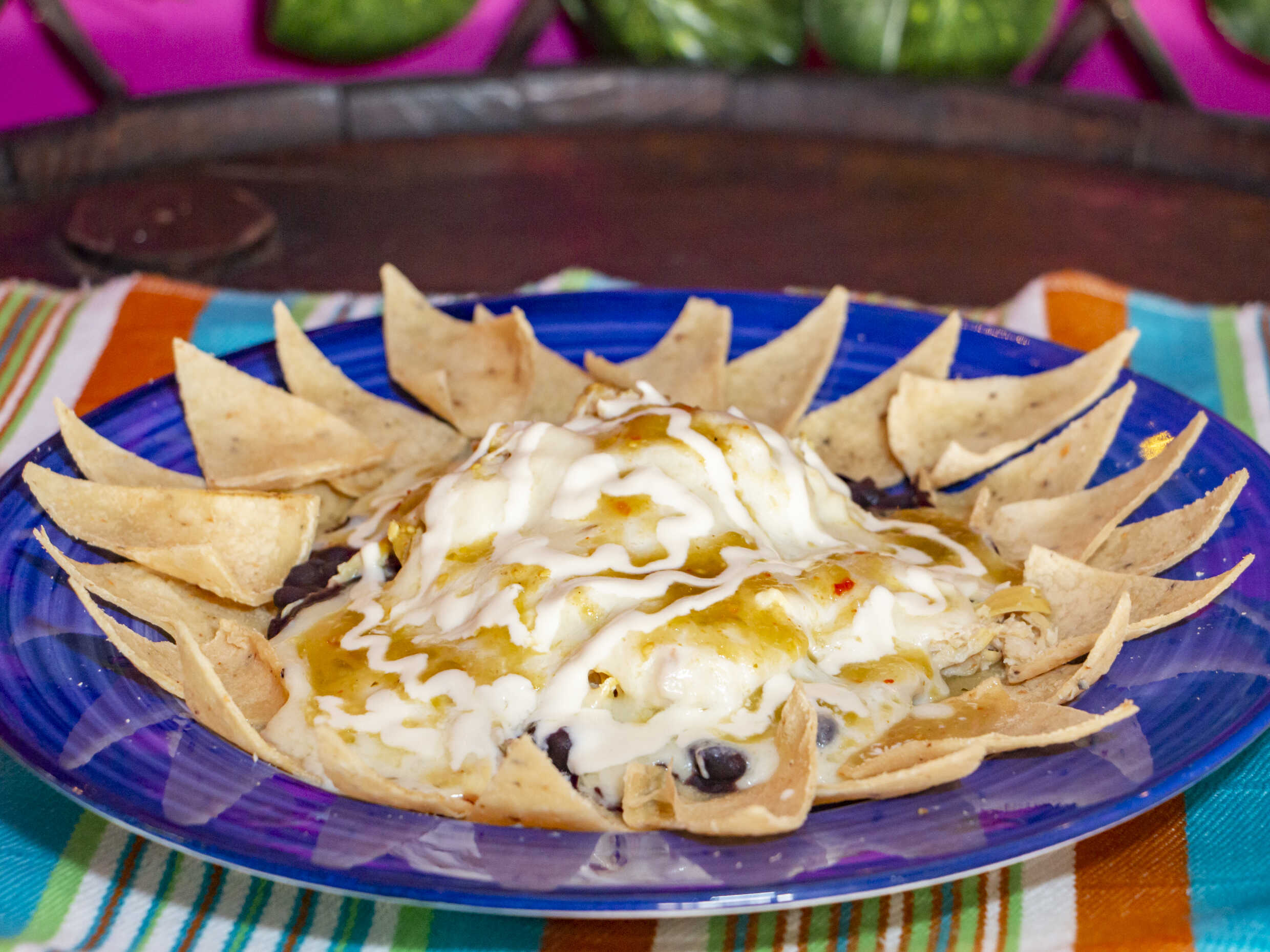 Tortilla de maíz con una cama de frijol, pollo, queso, crema y salsa picante.