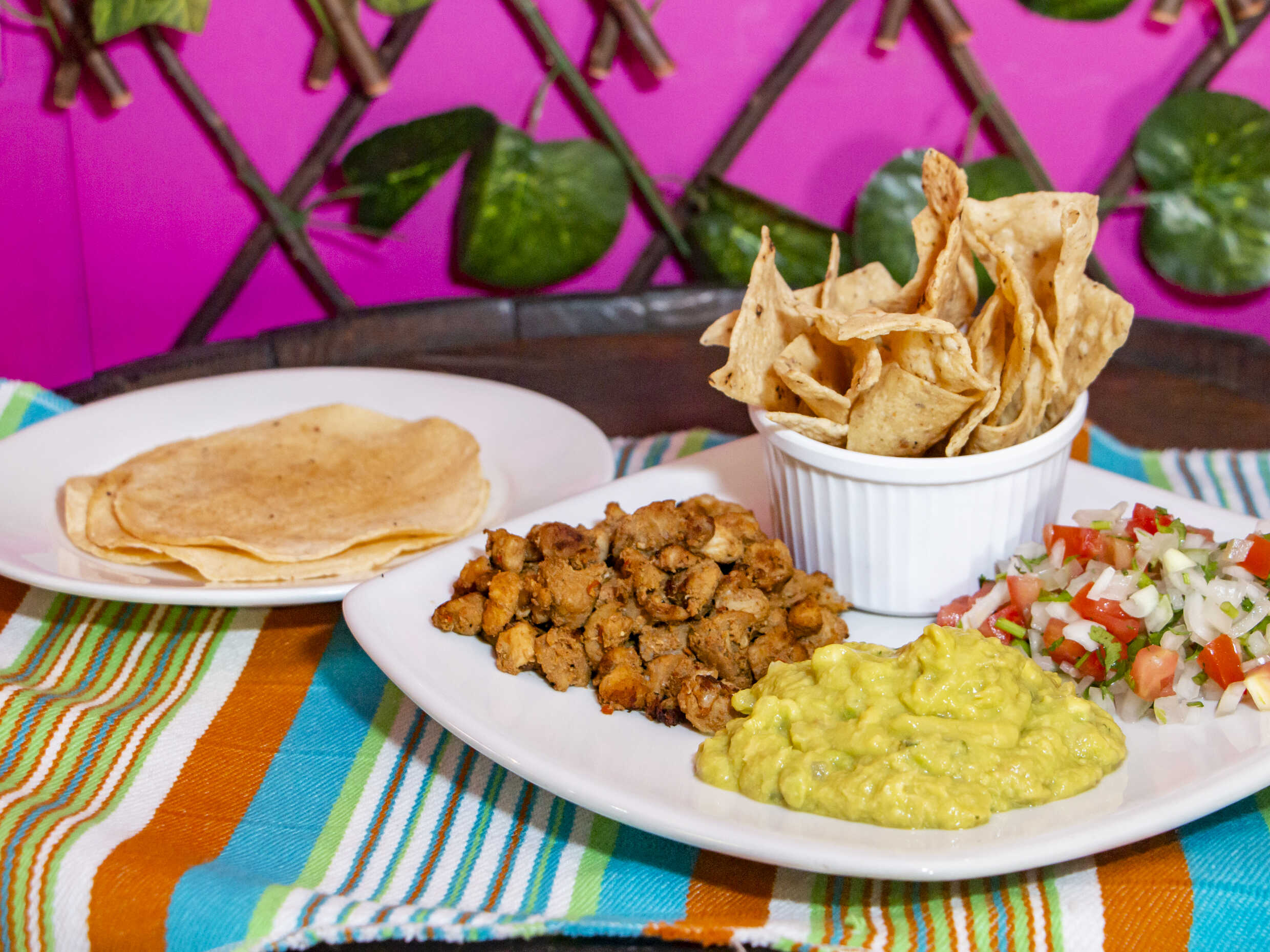 Carne, pico de gallo, guacamole, nachos, y tres tortillas de maíz.