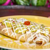 Tortilla de harina rellena de pollo, champiñones, cebolla, tocineta, aguacate, maicitos, crema, queso, acompañado de ensalada de lechuga y tomate.