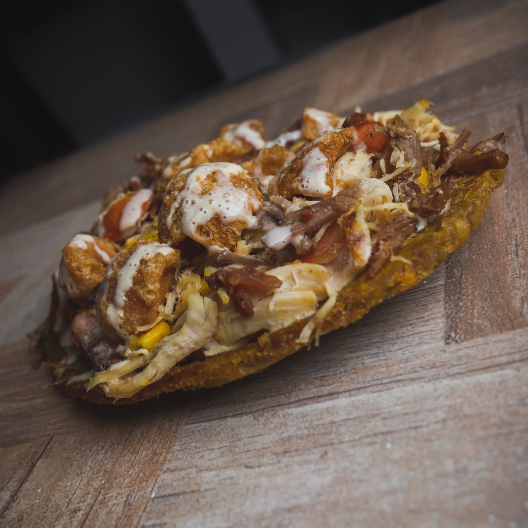 carne de cerdo desmechada, pollo desmechado, tocineta, chorizo, chicharron, maiz, y queso