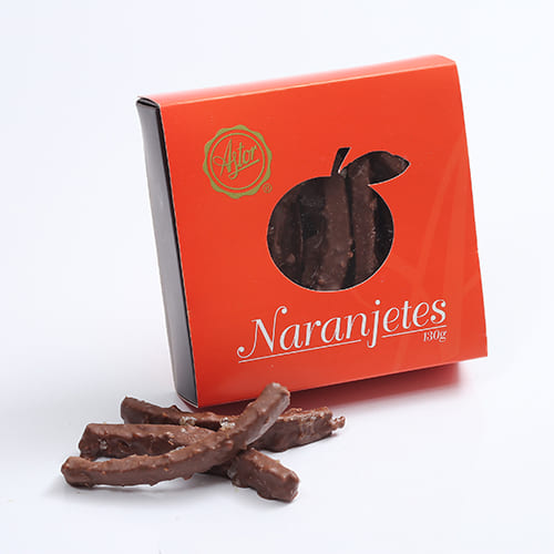Cáscara de naranja cristalizada cubierta con una mezcla de chocolate y crocante de maní.