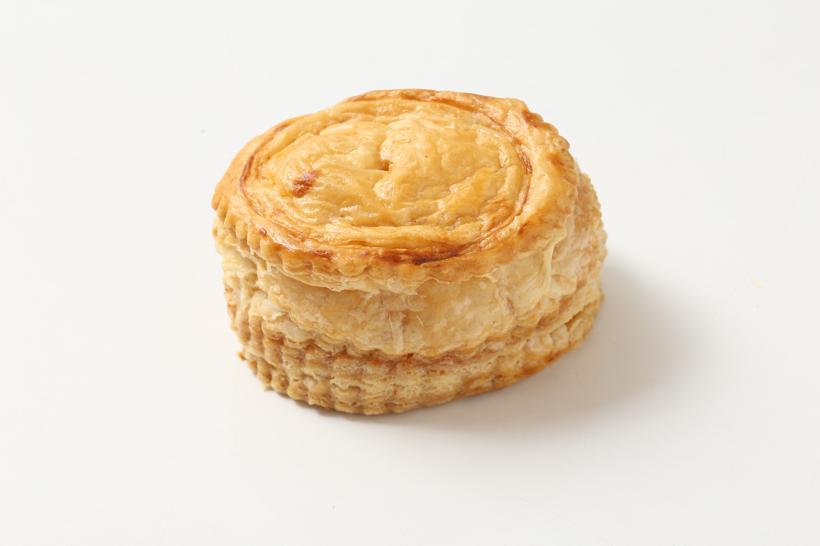 Pastel artesanal en hojaldre crocante relleno con pollo en salsa bechamel con verduras.