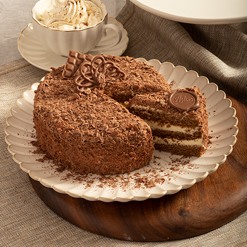 Bizcochuela de chocolate con capas de crema de leche, cubierta con viruta de chocolate sin azúcar adicionada. Tamạño corona 6 a 8 porciones.