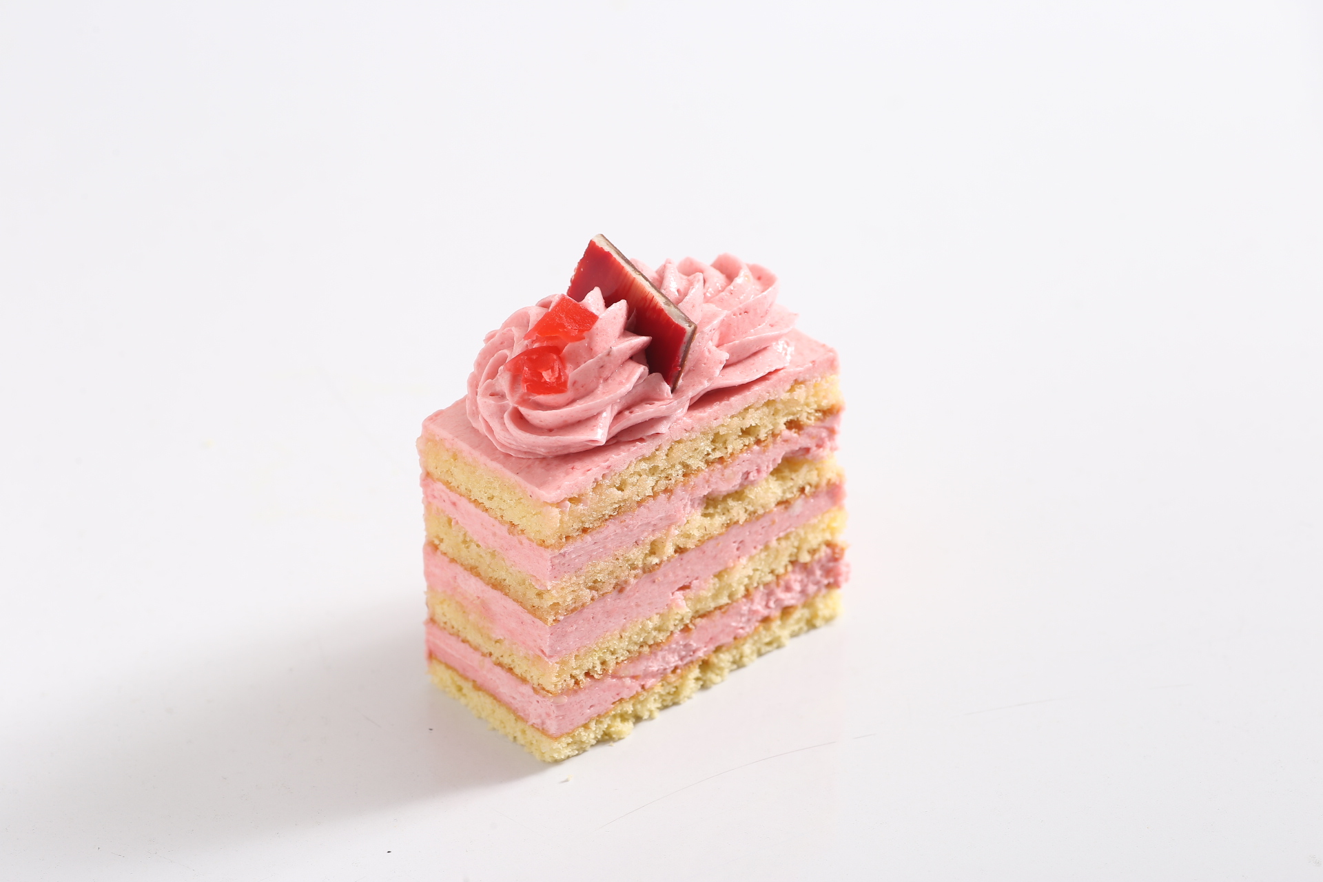 Bizcochuelo de vainilla con un toque de ron, frutas cristalizadas y crema de fresa.