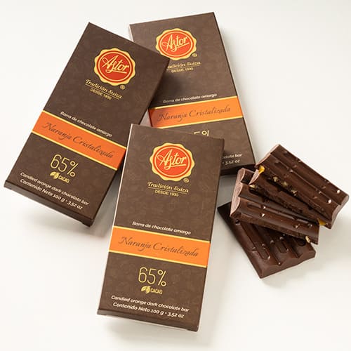 Barra de chocolate al 65 % de cacao con naranja cristalizada.