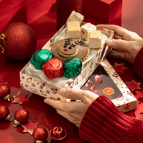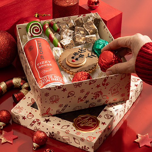 Caja regalo con galleta de mantequilla, dos mazapanes, tres besitos, lekerly y coctel en lata.