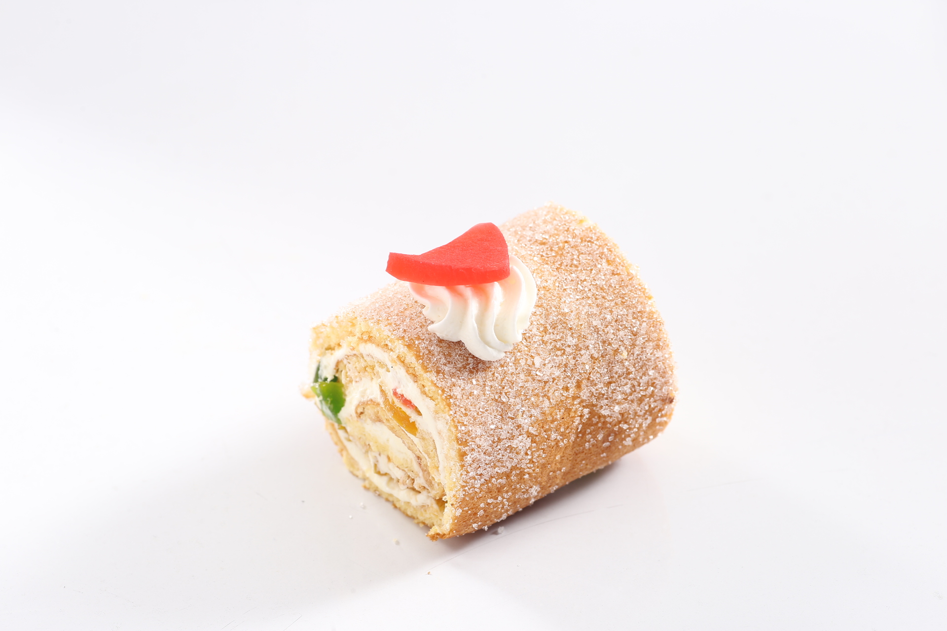 Bizcochuelo artesanal de vainilla, relleno con crema de vainilla y frutas cristalizadas.