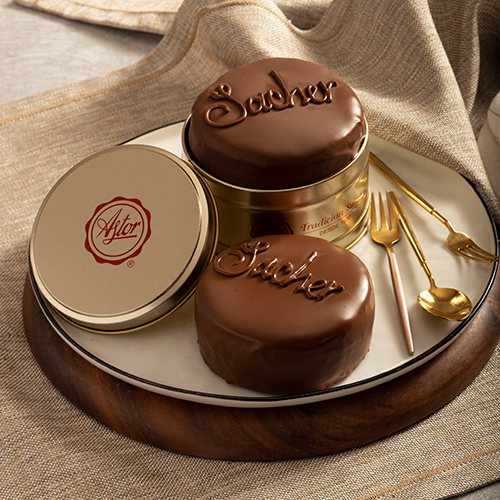 Bizcochuelo de chocolate en capas сon ganache de crema sacher, cubierta de chocolate semiamargo crocante. 3-4 Porciones, en estuche metálico.