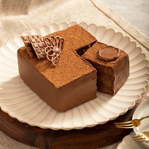 Bizcochuelo artesanal de chocolate con una capa de crema sacher, cubierto con chocolate semiamargo.