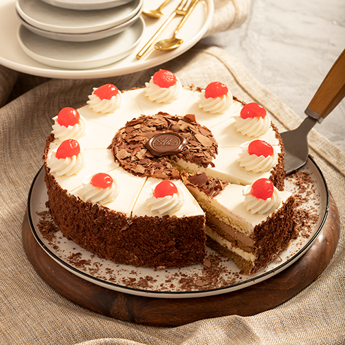 Bizcochuelo de chocalate y vainilla, con capas de crema de leche, cerezas en trozos y crema de chocolate. 6 a 8 Porciones.