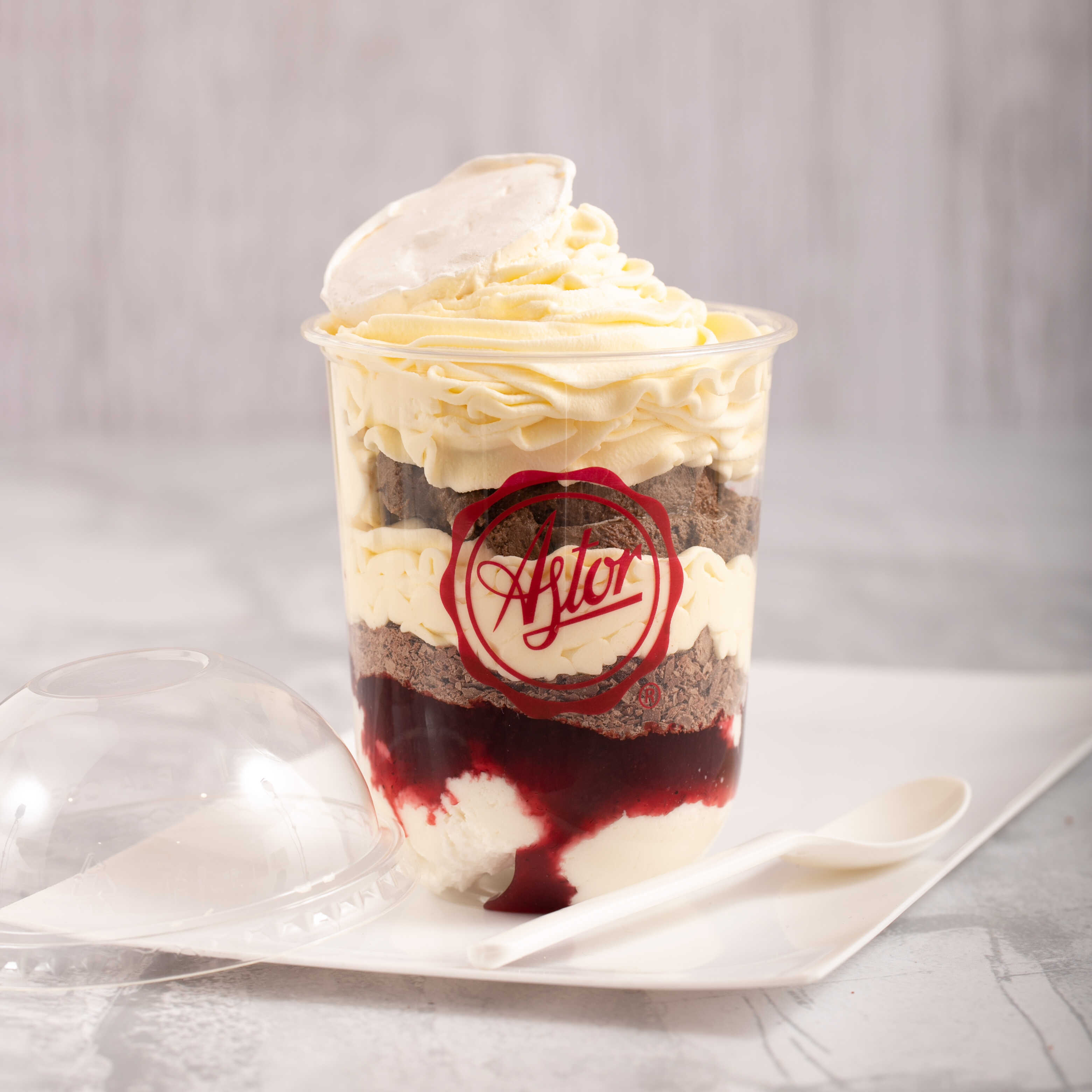 Helado de vainilla y chocolate, mermelada de mora, merengue, viruta de chocolate y crema chantilly.