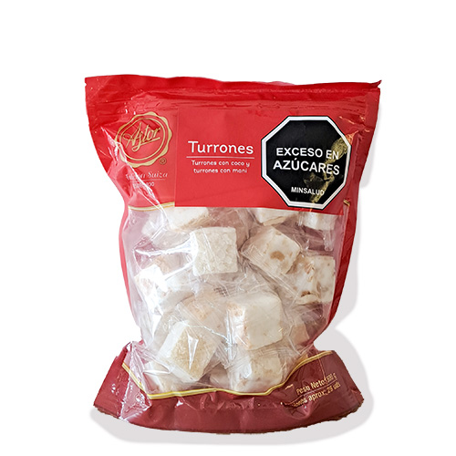 Turrones tradicionales masa dulce, blanca, firme y tiruda, adicionada con coco y con maní, 250 g.