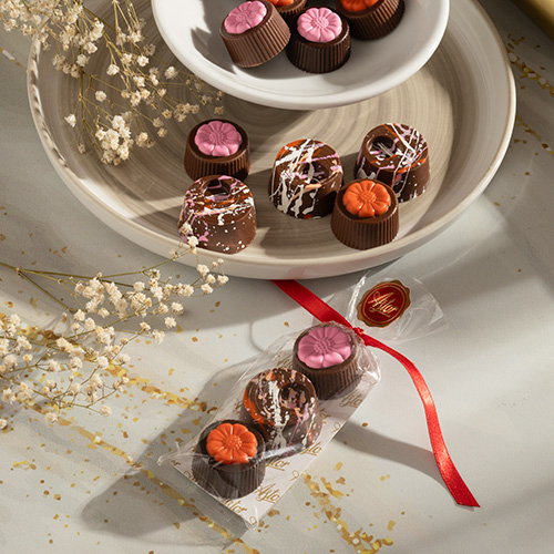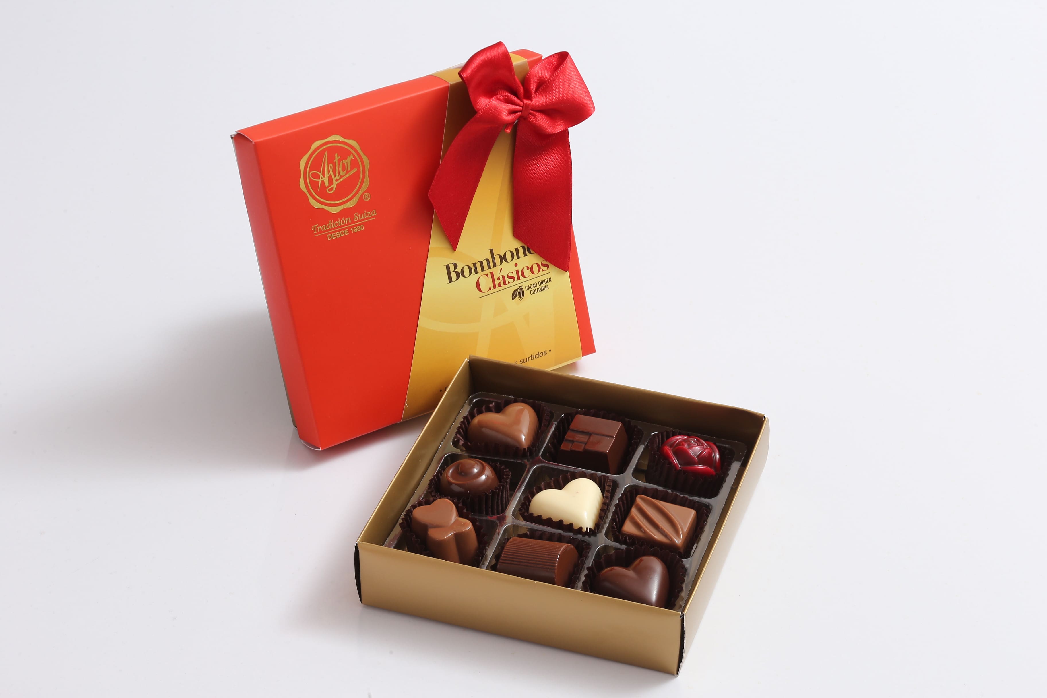 Bombones artesanales de chocolate gourmet con variedad de rellenos, crema sacher, ganache, frutas, caramelo, licor, frutos secos y mazapán. 9 unidades.