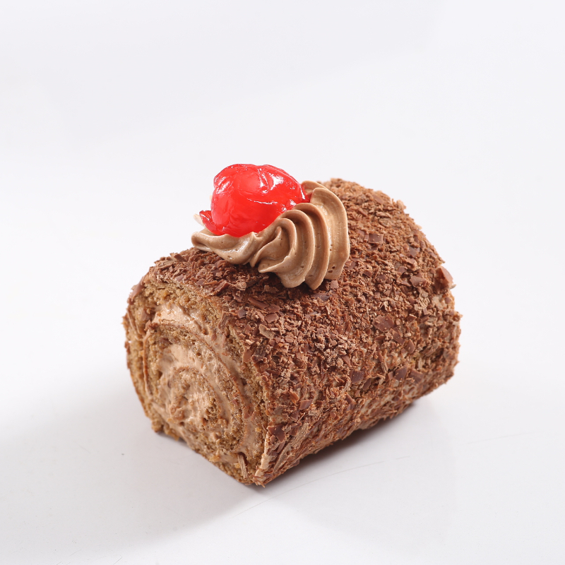 Bizcochuelo artesanal de chocolate cubierto de viruta, relleno con crema de chocolate y cerezas.