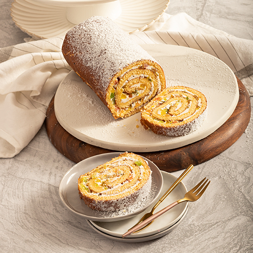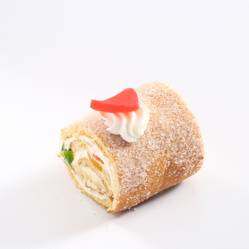 Bizcochuelo artesanal de vainilla, relleno con crema de vainilla y frutas cristalizadas.