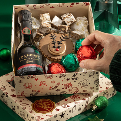 Caja regalo con galleta de mantequilla, cuatro besitos, lekerly y piba de vino.
