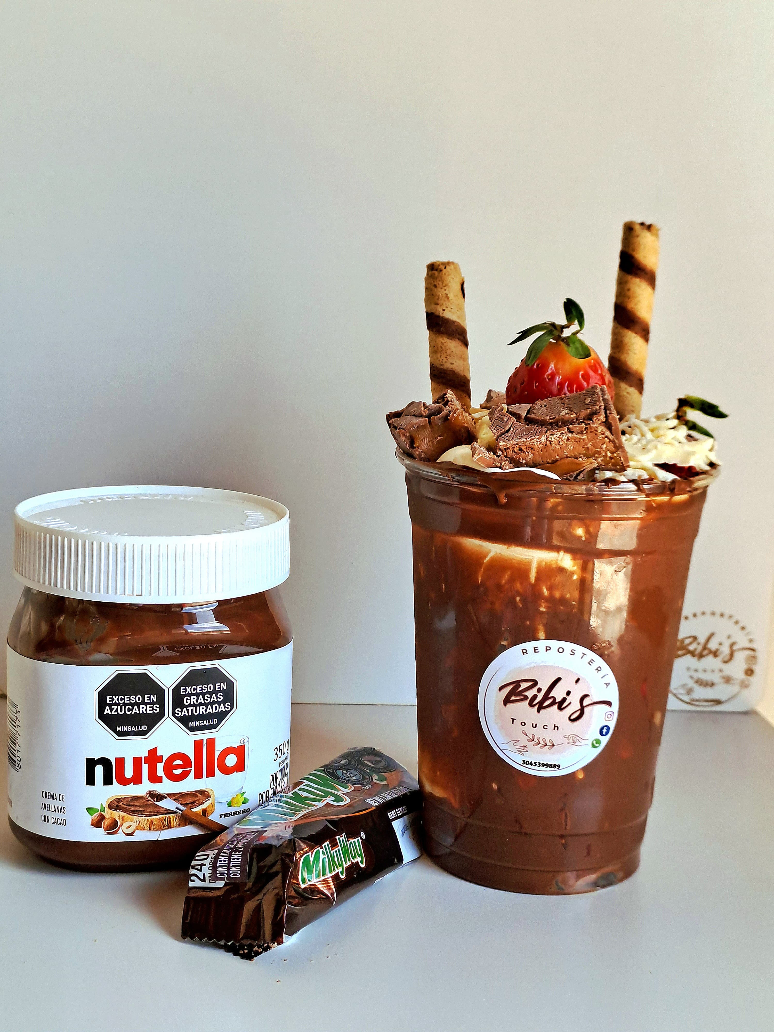 Fresas, crema especial, lecherita, salsa Hershey´s, queso, Oreo, chocoramo, m&m's, masmelos, lluvia de chocolate, vaso 24 oz.