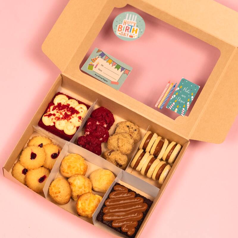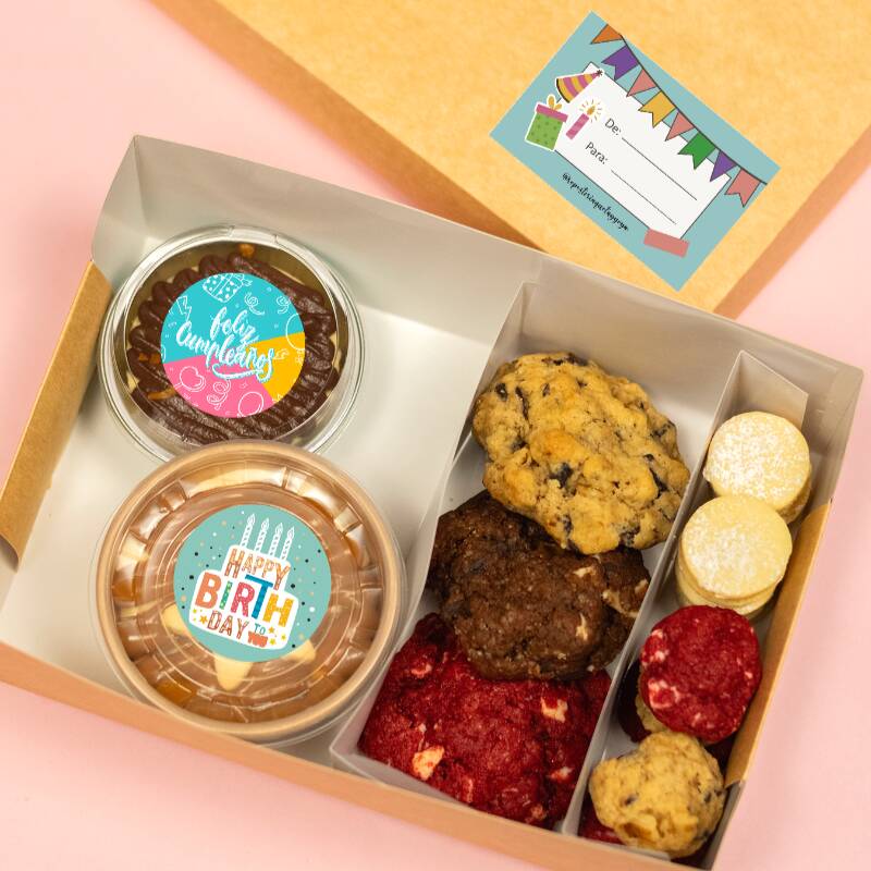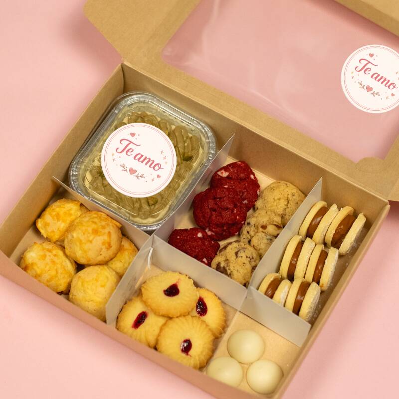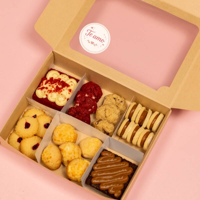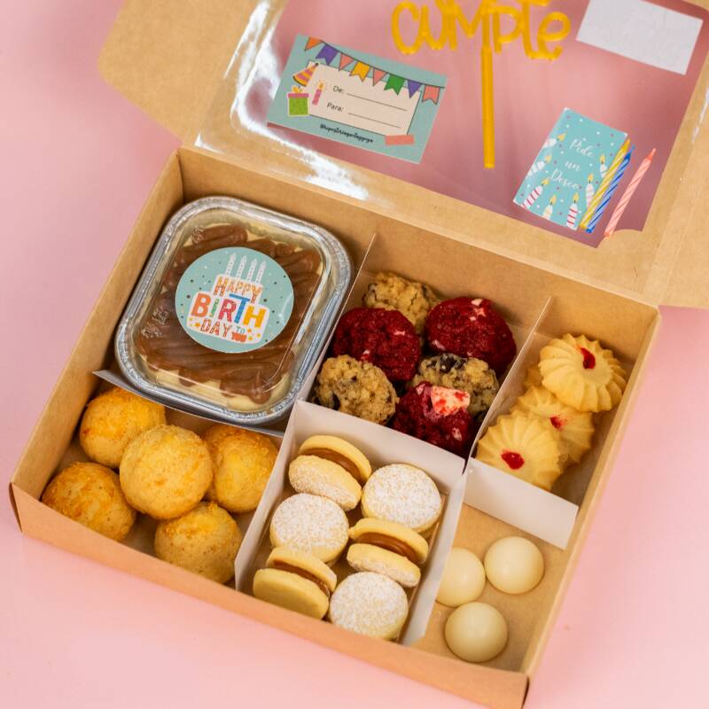 Cajita llena de dulces detalles: 2 postres del sabor que elijas, 3 alfajores, 2 galletas chips, 3 bizcochitos de queso, 2 chocolates y 5 galletas de mantequilla