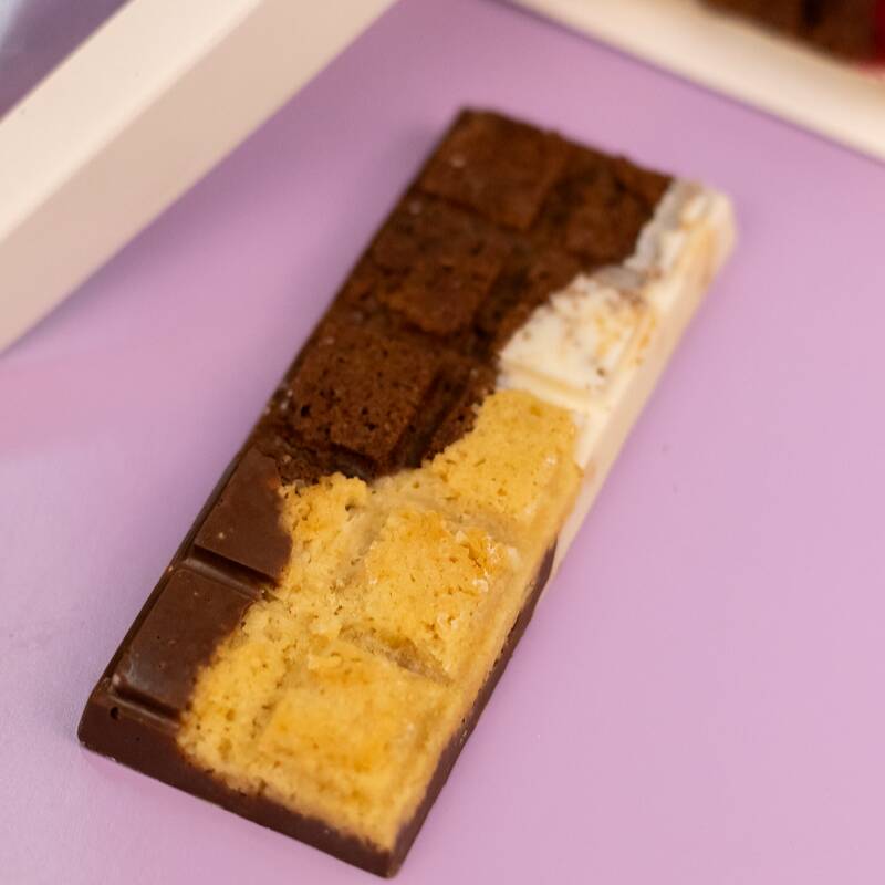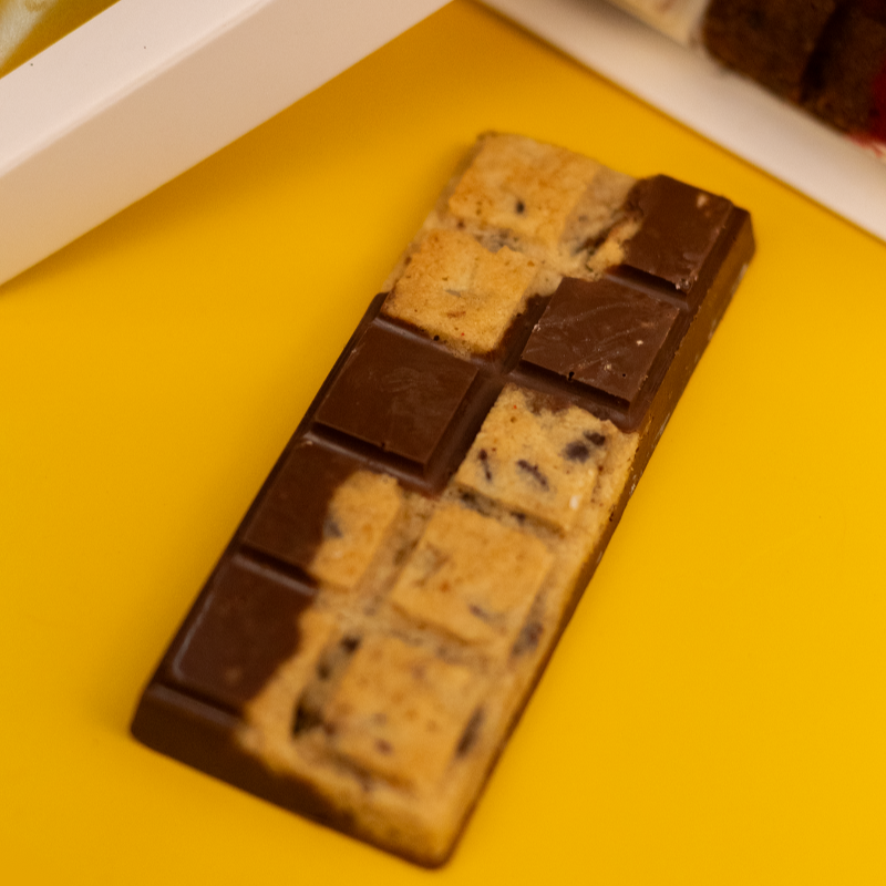 Deliciosa barra con trozos de nuestra irresistible cookie de vainilla y cookie de doble chocolate de siempre con una capa gruesa de chocolate blanco y chocolate de leche que se derrite en la boca, haciendo una explosión de sabores única. Medidas 11.5cm x 4.5cm x 1.5cm (65gr aproximadamente)
