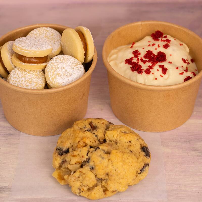 3 cuchareables de 8oz (150gr) cada uno del sabor que elijas o 3 mini cheesecakes de 130gr + 1 bowl de 16oz x16 unidades de mini alfajores o 1 bowl de 15 little cookies +3 galleta new york del sabor que elijas.