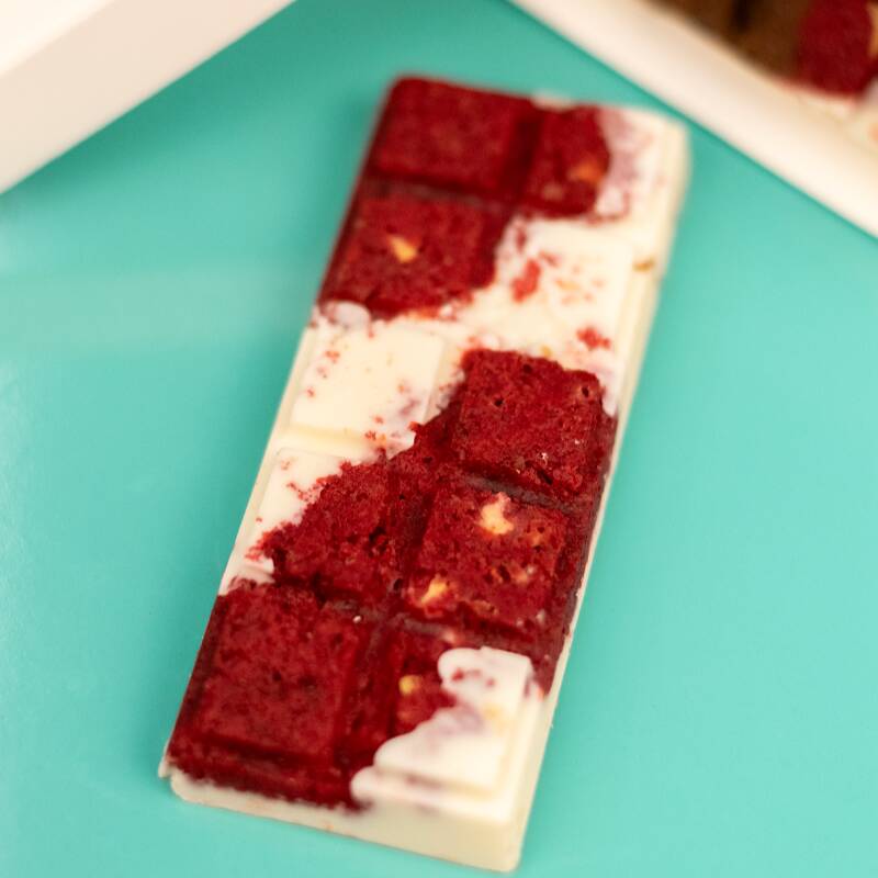 Deliciosa barra con trozos de nuestra irresistible cookie red velvet de siempre con una capa gruesa de chocolate blanco que se derrite en la boca, haciendo una explosión de sabores única. Medidas 11.5cm x 4.5cm x 1.5cm (65gr aproximadamente)