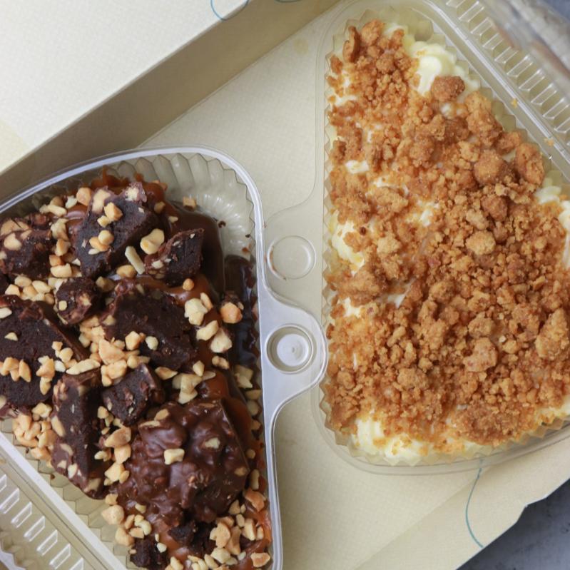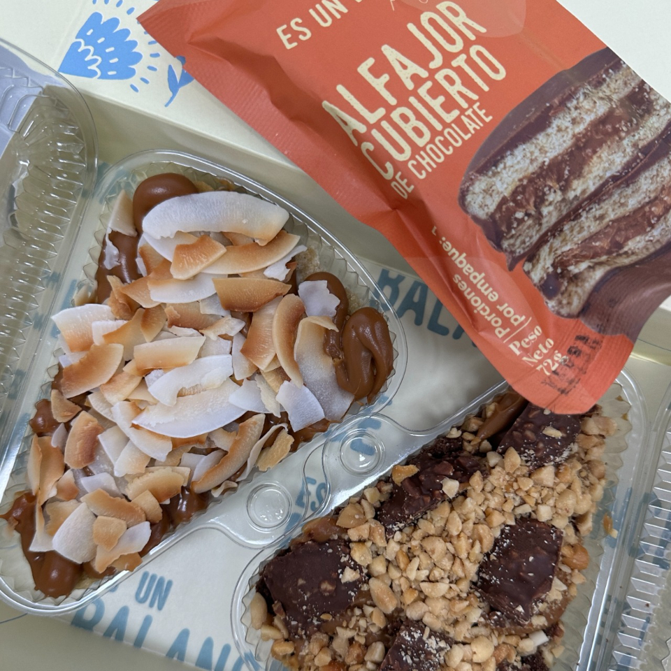 La cajita feliz de la semana incluye: 1 postre 3 leches remojado en leche de almendras y leche de coco, arequipe y coco laminado, 1 cuchareable de chocolate, arequipe, trufas y maní, y 1 alfajor cubierto en chocolate.