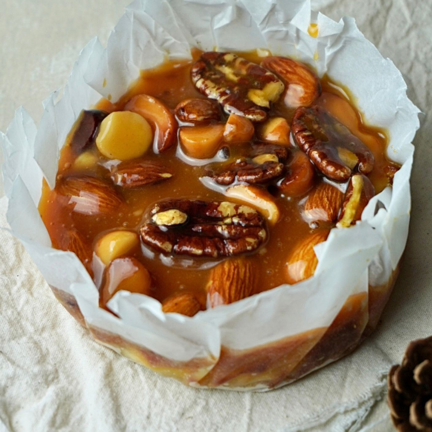 Tarta vasca con caramelo salado sin azúcar y frutos secos (pecanas, macadamias y almendras).