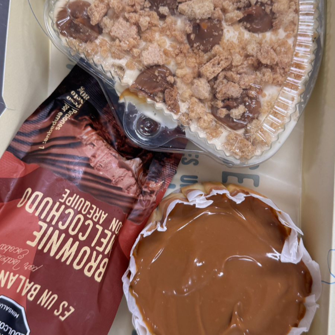 La cajita de la semana incluye: (Nuevo) 1 Banana pudding: crema de vainilla, banano y galleta. 1 brownie keto melcochudo y 1 tarta vasca con arequipe
