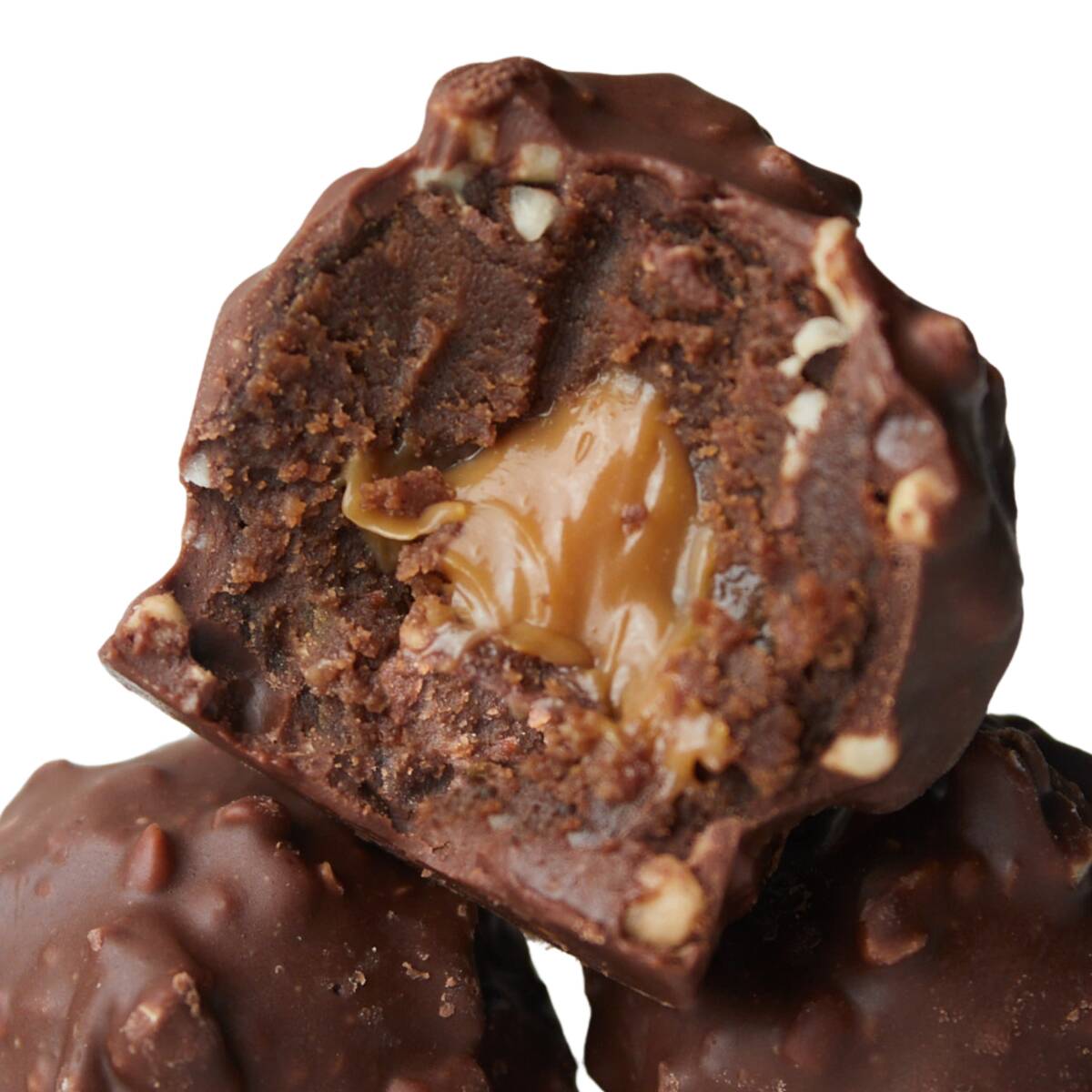 Trufas de brownie rellenas de arequipe cubiertas en choco-maní.