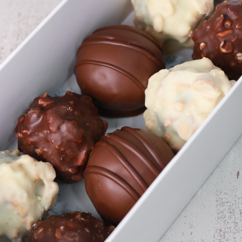 Caja de trufas de brownie, trufas de brownie y chocolate blanco y trufas de galleta.