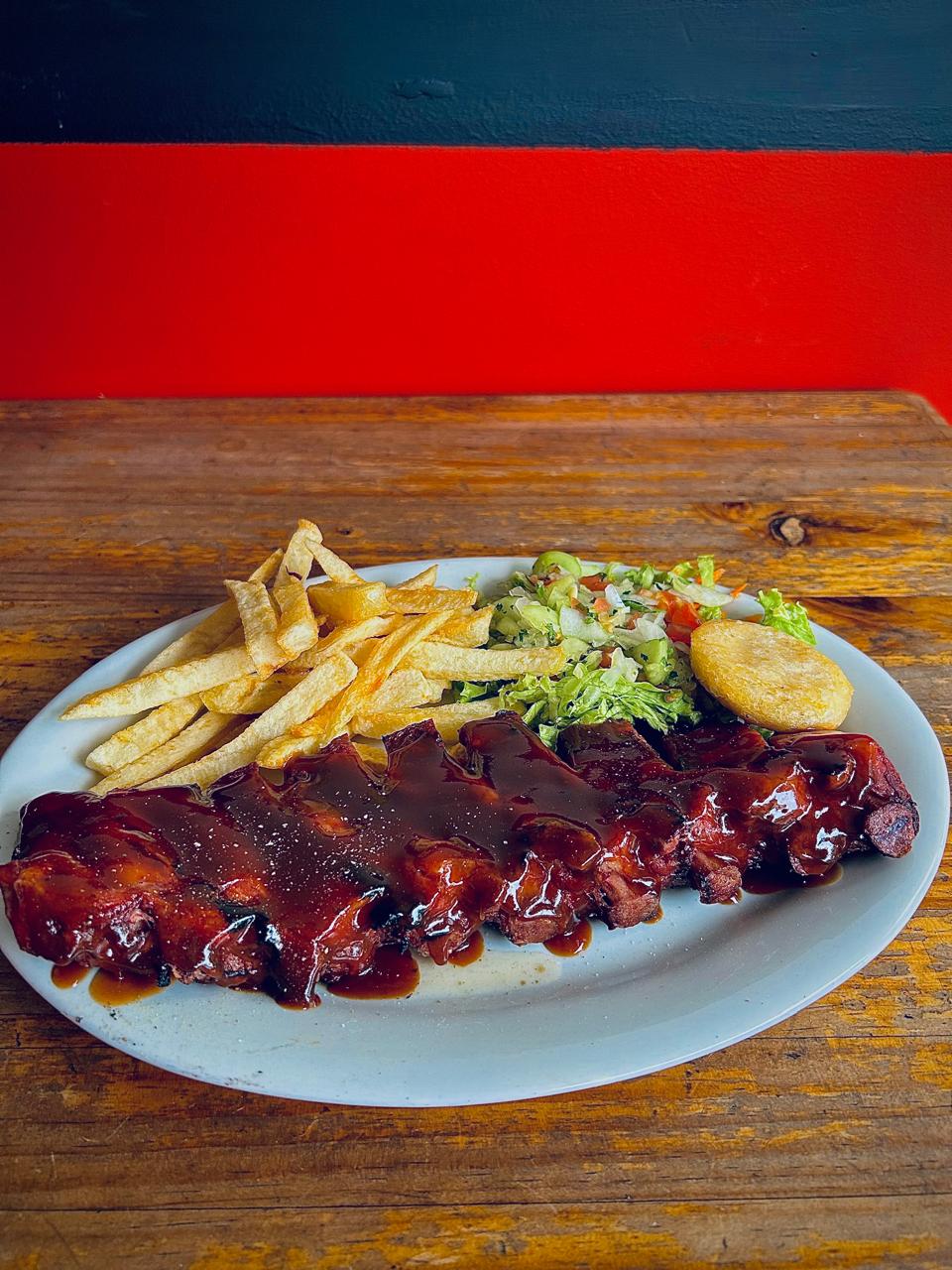 400 g de costilla de cerdo cubierto en salsa BBQ acompañadas de papas al vapor o francesas, arepa y ensalada.