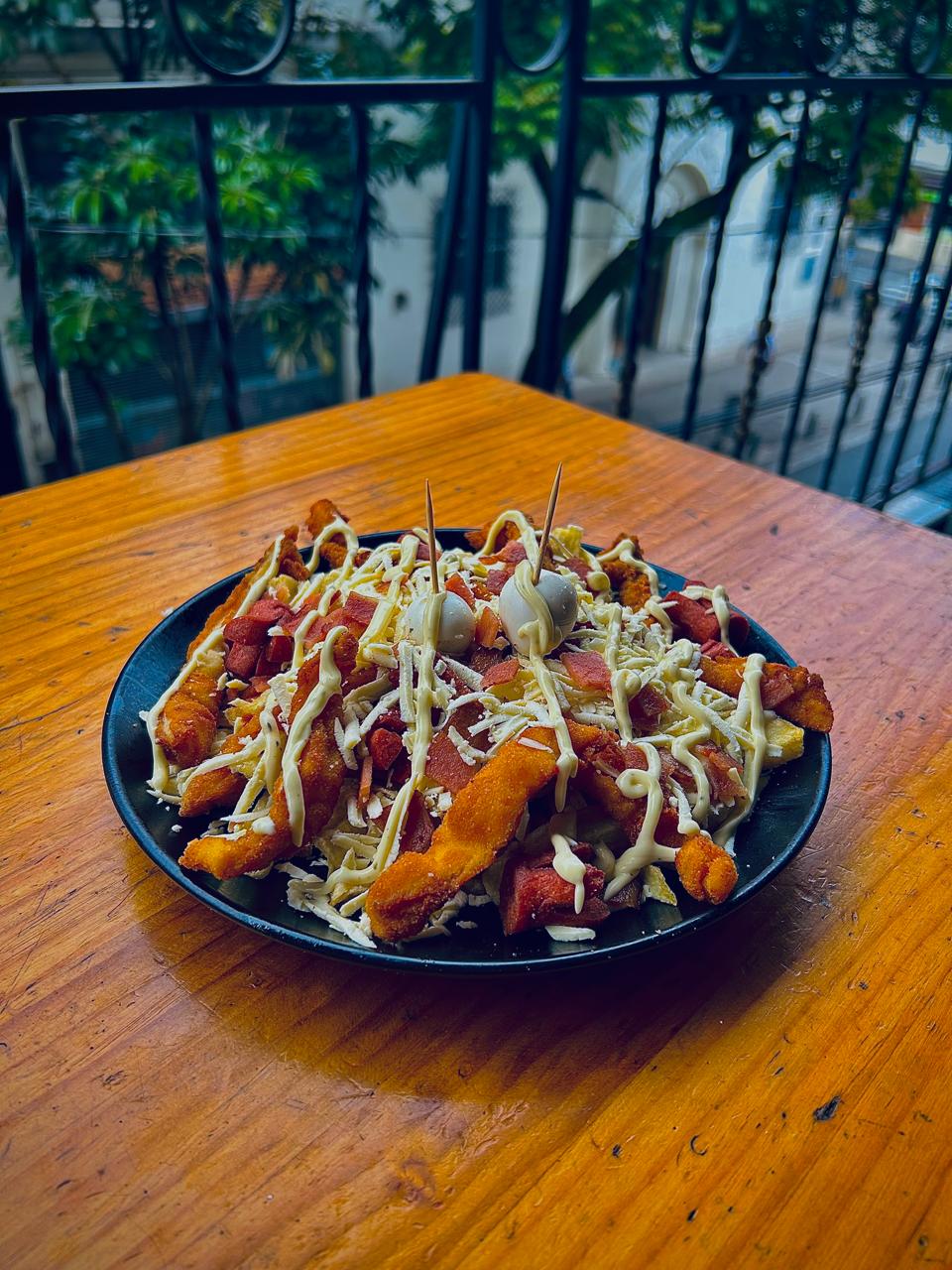 Huevitos, salchicha, tocineta, bastones de pollo apanado, queso rallado, salsa de la casa y papas a la francesa.