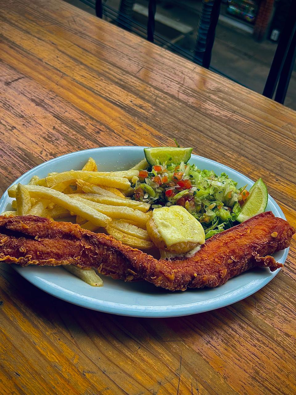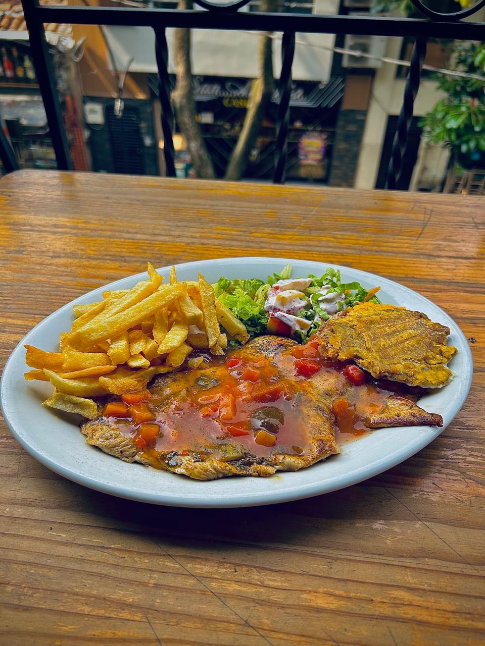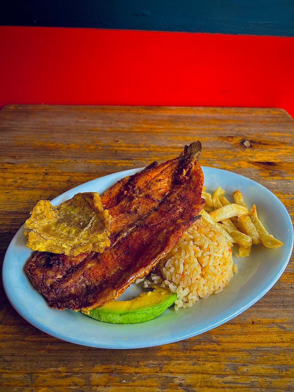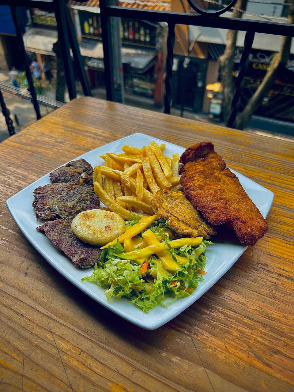 250 g de filete de pescado apanado con carne de cerdo, res, pollo o chicharrón, papas al vapor, arepa, patacón y ensalada.