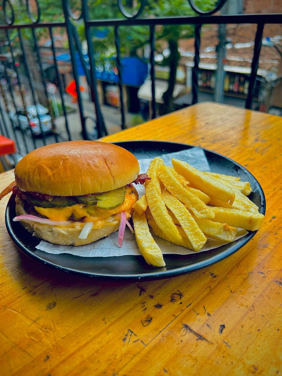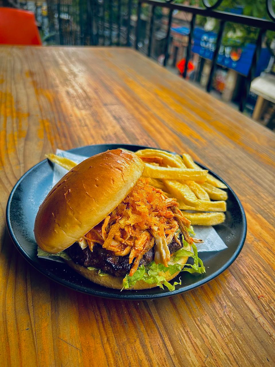 Pan brioche, carne de res, chicharrón ahumado bañado en nuestra salsa barbimiel, vegetales, salsa de la casa y viruta de papa.